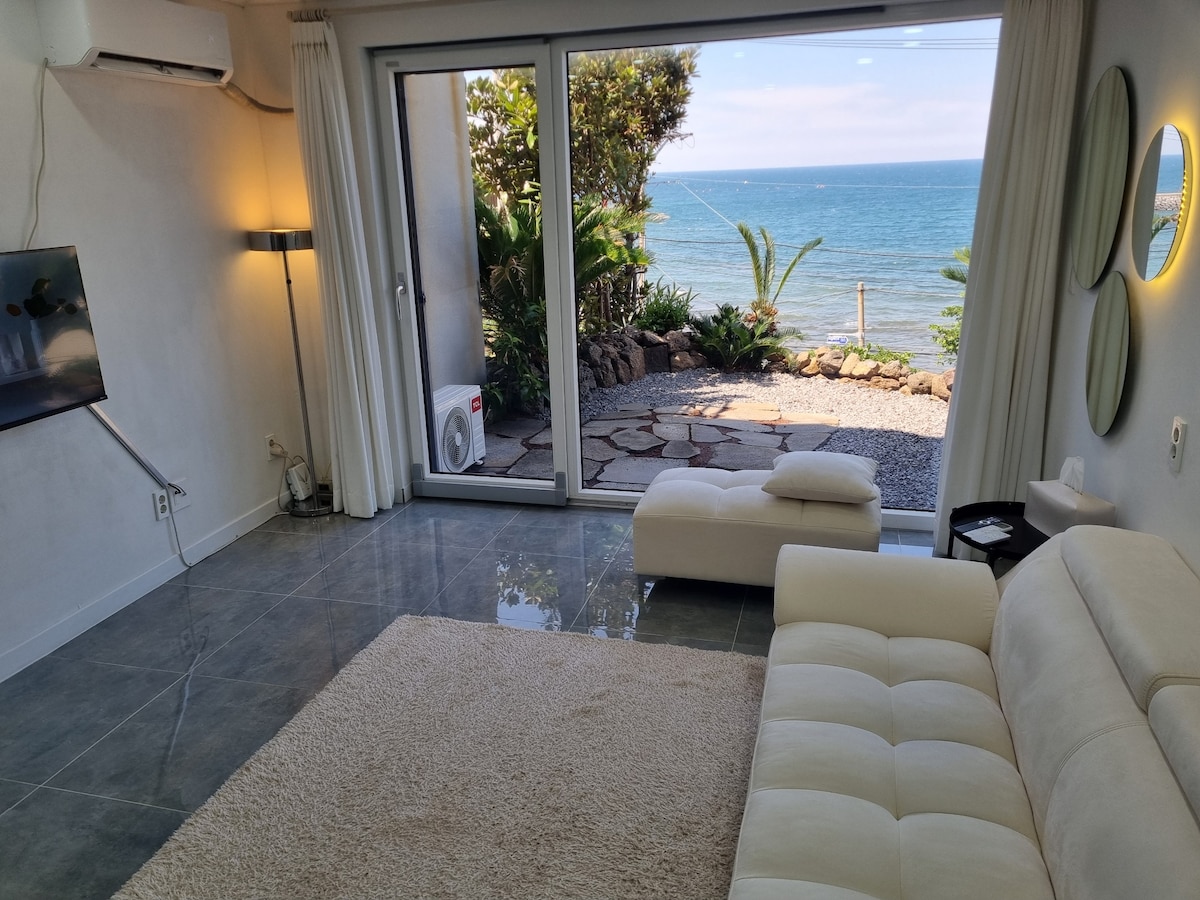 Gisting með sjávarútsýni með litlum garði og verönd með sjávarútsýni (1 Simmons queen-rúm fyrir þægilegan svefn, 3 Simmons super-einbreið rúm) Hvítt innra rými fyrir Insta Þú getur horft á sjónvarpsþjónustu Netflix Það eru margir veitingastaðir í nágrenninu og það er rétt við hliðina á matvöruverslun og það er þvottavél með heitu og köldu vatni. Reykingar eru leyfðar í garðinum.