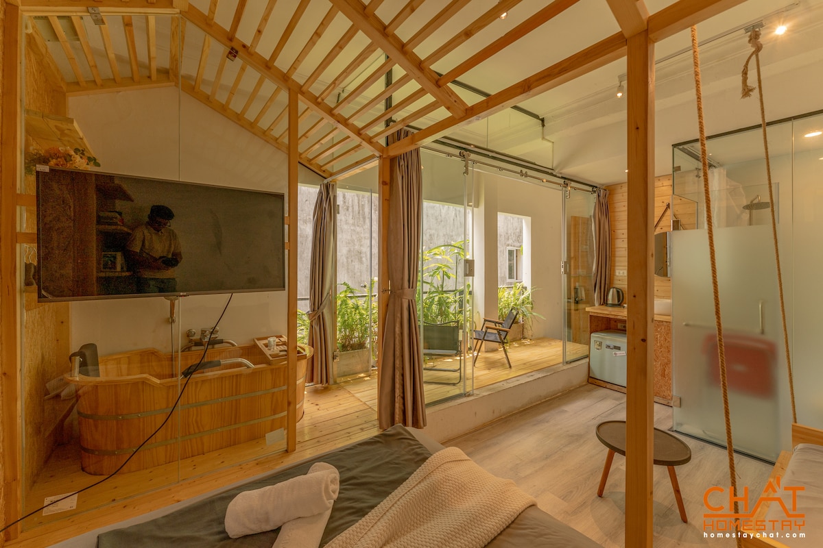 Notalegt stúdíó með náttúrulegri viðarhönnun og einkasvölum undir berum himni sem eru fullar af gróðri. Það er á 4. hæð í byggingu í öruggu og rólegu hverfi nálægt Trúc Bảch Lake. Fullkomið fyrir ferðalanga sem eru einir á ferð eða pör sem leita að friðsælu afdrepi. Frú Nghảa er í boði í byggingunni til að aðstoða þig hlýlega utan nets alla daga frá kl. 9:00 til 16:30.