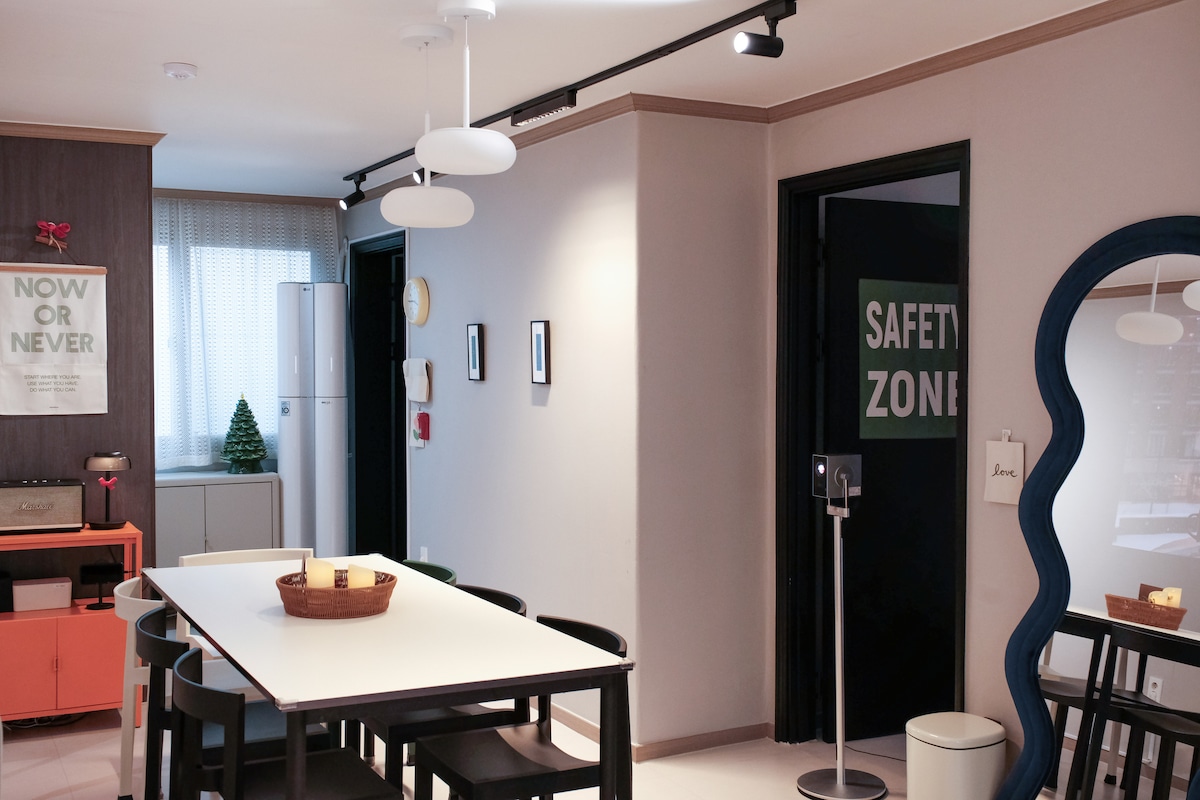 🌿 Daon, Yeoungdeunpo stay „Lítið kyrrðarrými í hjarta borgarinnar“ 2 mínútna göngufjarlægð frá Yeongdeungpo-gu skrifstofustöðinni (lína 2, 5) Þegar þú notar eðalvagn á flugvelli Incheon Airport No.➡️ 6008 Limousine Bus Yeongdeungpo-gu➡️ Office, Get off at Hyundai Apartment stop (2 minutes on foot) 🛏 Hlýlegt og þægilegt 2 svefnherbergi Notalegt svefnherbergi þar sem sólin er notaleg Bókaðu góðan nætursvefn með vönduðum rúmfötum og tilfinningalegri lýsingu Heilunarrými þar sem þú getur endað daginn á að horfa á Netflix Lítið eldhús með 🍳 tilfinningalegri innréttingu Kaffibolli, sopi af samræðum... 🛁 Nútímaleg innrétting á baðherbergi Búin grunnþægindum Hrein baðherbergi Fullbúið með 📺 ókeypis þráðlausu neti og snjallsjónvarpi YouTube með Netflix Fullkomið fyrir sjálfsskoðun og tilfinningalegt vlogg! „Chef‘s Aidul“, 🥐 tilfinningaþrunginn munnur Vinsæl kaffihús í bakaríi viðurkennd af heimamönnum 1 mín. 📍 göngufjarlægð frá eigninni minni Nýbakað brauð og mjúkt kaffi ☕ á hverjum degi Byrjaðu ✨ morguninn betur á ilmandi 💬 „Hittu mig í Daon, lítilli kommu í hávaðasömu daglegu lífi.“