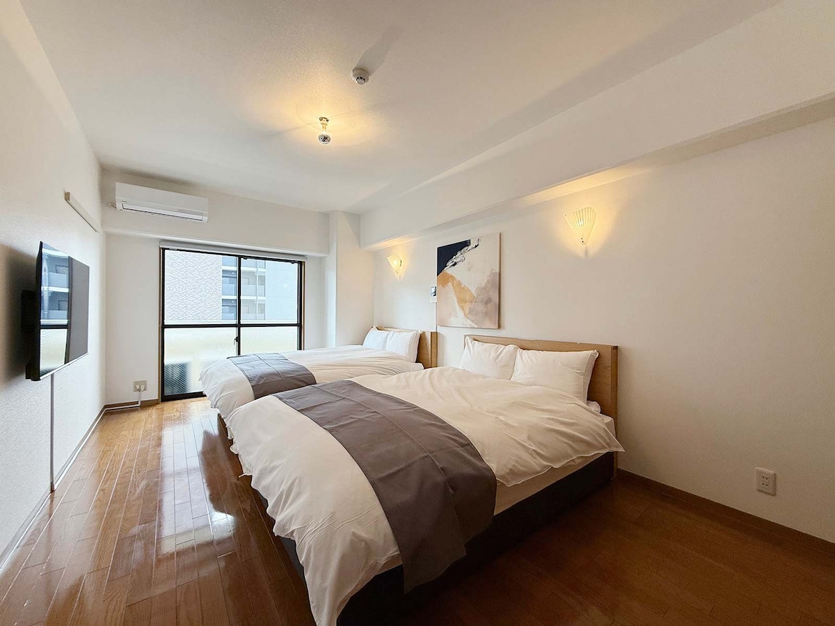 1Br íbúð Aðeins 30 Sec getur náð til Hiroshima Arcade Íbúð með 1 svefnherbergi eru með 2 rúmum : 2 Queen size rúm. Hámarksfjöldi gesta er 4 manns í þægilegri gistingu. *Um barnarúm Vinsamlegast spyrðu fyrirfram um framboð á barnarúmum áður en bókun er gerð, þar sem það eru takmörk fyrir fjölda ungbarnarúm í boði. 5 mínútna gangur að PeacePark 10 mín götubíll getur náð til Hiroshima JR stöð Allir veitingastaðirnir / Lyfjaverslun/ Kaffihús / Verslunarsvæði eru í kringum bygginguna