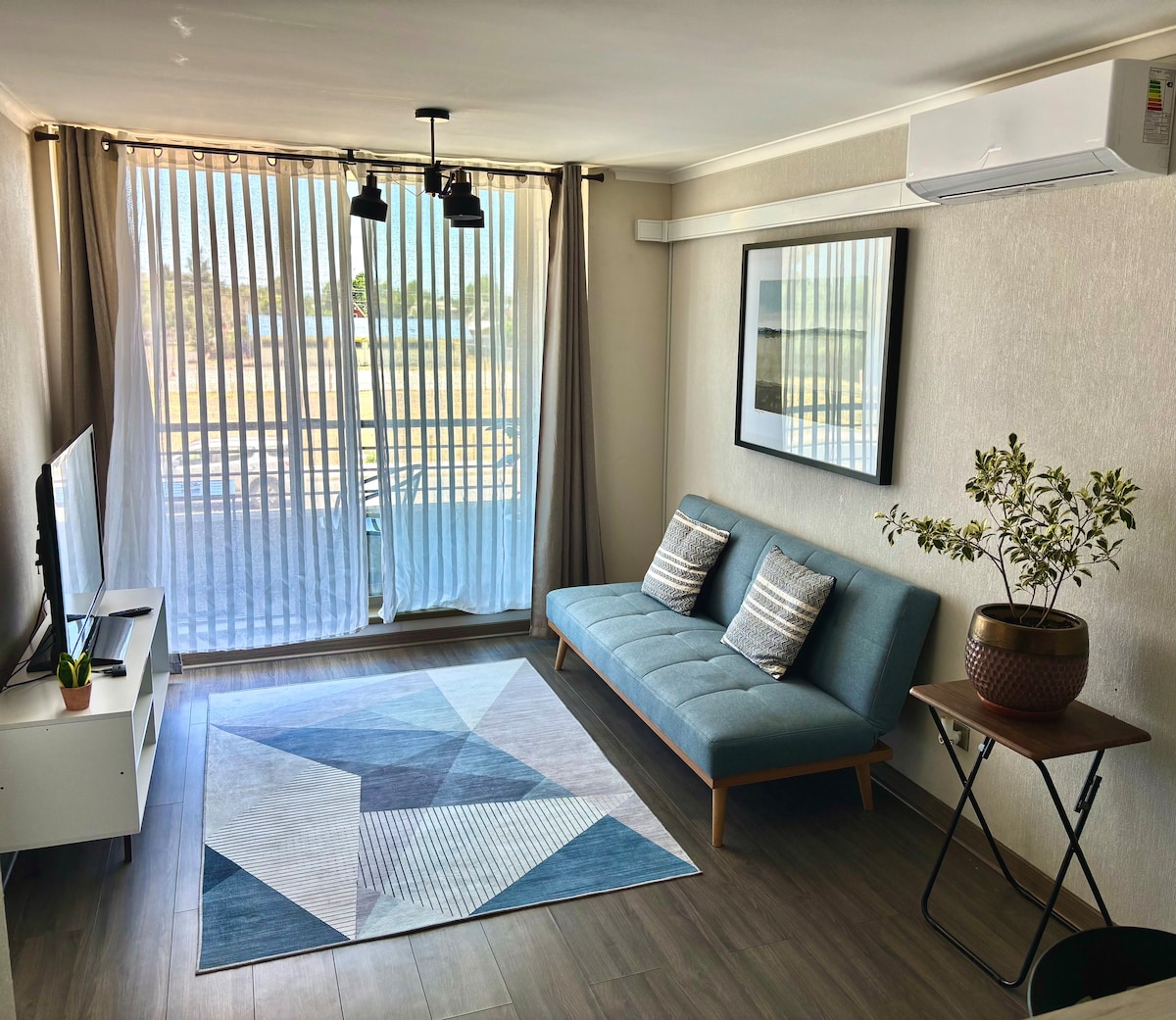 Estamos ubicados después del retén de carabineros, si , te ahorrarás el famoso taco que se forma en invierno. Ven y descansa en medio del bosque nativo con acceso directo a circuitos de treking, cascadas, flora y fauna. El departamento tiene 40 metros cuadrados más terraza. Este cuentan con una cama King (180x200), baño, chiflonera o acceso ( donde dejar todo tu equipo de ski ), cocina más una mesa comedor y un espacio con dos poltronas frente a un gran ventanal para disfrutar de las vistas.