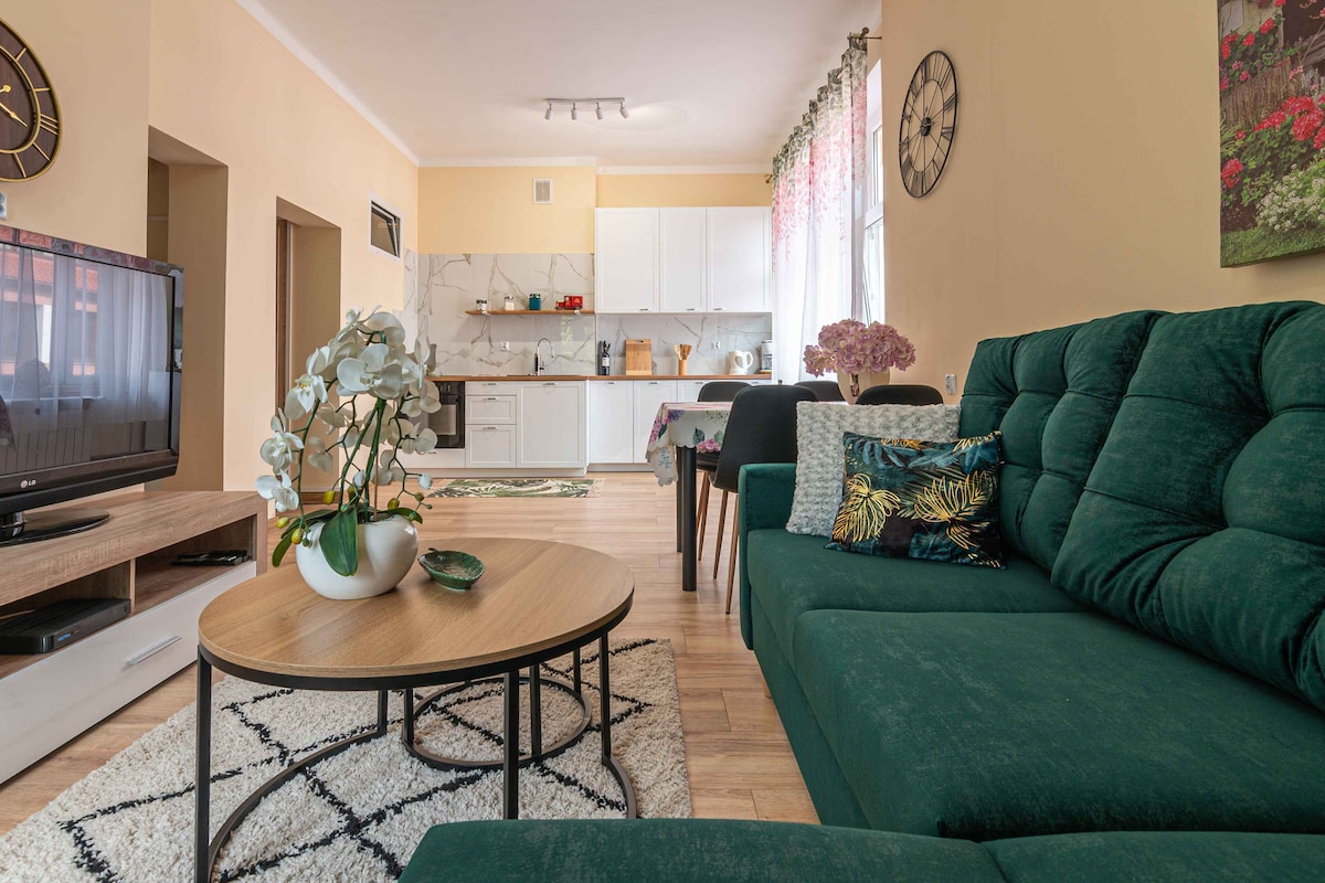 Þægileg stofa: Íbúðin býður upp á eitt svefnherbergi, stofu og baðherbergi. Í boði er loftkæling, eldhúskrókur og verönd með útsýni yfir garðinn. Nútímaþægindi: Gestir eru með ókeypis þráðlaust net, þvottavél og uppþvottavél. Önnur aðstaða felur í sér gjaldskylda skutluþjónustu, lyftu, setusvæði utandyra, fjölskylduherbergi og leiksvæði fyrir börn. Þægileg staðsetning: Staðsett í Oświęcim, eignin er 58 km frá John Paul II International Kraków–Balice Airport.
