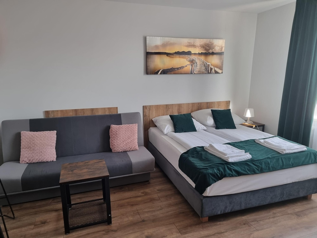 Stúdíóíbúð, andrúmsloft og notaleg með samtals 18m2 svæði. Hún er búin þægilegum tvöföldum svefnsófa, svefnaðstöðu 160/200 Íbúðin er með fullbúnum eldhúskrók og baðherbergi með sturtu. Herbergið er einnig með snjallsjónvarp og þráðlaust net. Íbúðin er með stórum svölum . Ókeypis bílastæði. Eftirlitslaus innritun í íbúðina með kóðum.