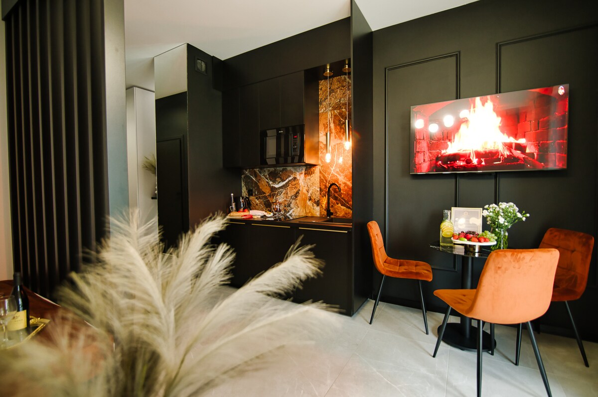 Íbúð með fágaðri og stílhreinni hönnun sem samanstendur af einu svefnherbergi, stofu, eldhúsi og baðherbergi. Stofan er rúmgóð og búin flatskjásjónvarpi sem gerir þér kleift að horfa á uppáhaldsþættina þína í háum gæðaflokki. Í stofunni er einnig þægilegur sófi. Svefnherbergið er notalegt og þægilegt. Í svefnherberginu er stórt rúm sem veitir mikil svefnþægindi. Eldhúsið er fullbúið með öllum nauðsynlegum hlutum. Baðherbergið er fágað og hagnýtt.