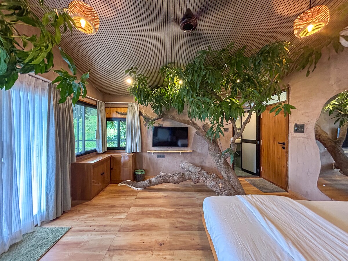 Perched on a mango tree with breathtaking valley and mountain views, Sutra is a unique treehouse where nature lives with you — the tree itself grows inside the room. Blending sustainable design with modern amenities, it offers comfort, charm, and a private deck to unwind. Perfect for couples, solo travelers, or a small family of three seeking a peaceful escape into the wild.
