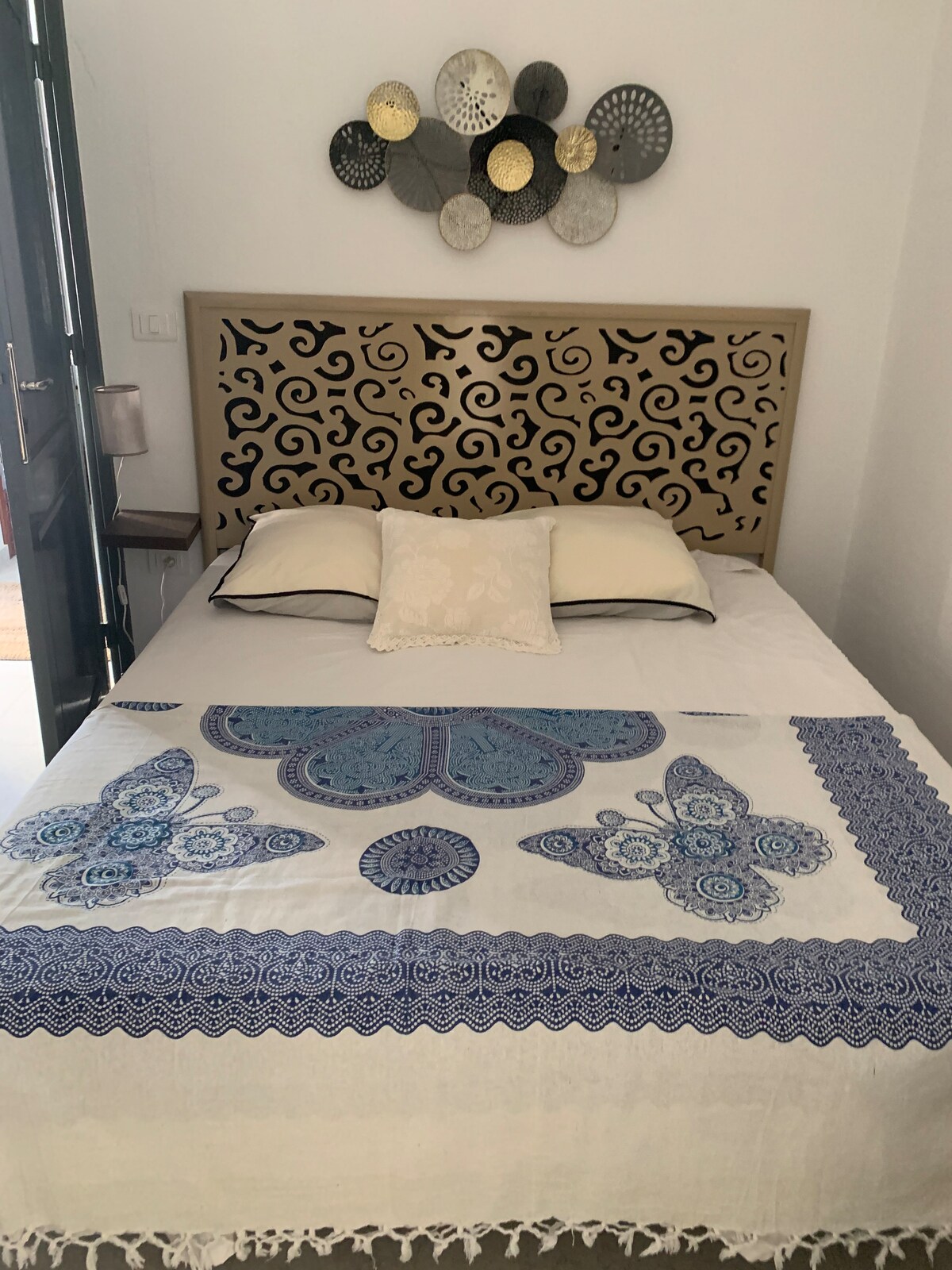 Nálægt Djerba, í pálmalundi, blómlegum garði, nálægt fiskveiðiströnd, 240 m². 6 svefnherbergi (fjögur með loftkælingu), márísk stofa og 3 verandir. Keeper, möguleiki á að fá einhvern til að sjá um máltíðir eða þrif meðan á dvölinni stendur. Ég votta að konan hans eldar vel. Útgönguþrif innifalin. Gestir eru varaðir við því að loftslagið sé ekki Miðjarðarhafið heldur Sahelian: sandvindur, sem hefur áhrif á þrif, mjög heitt á sumrin, salt svo ryðgað
