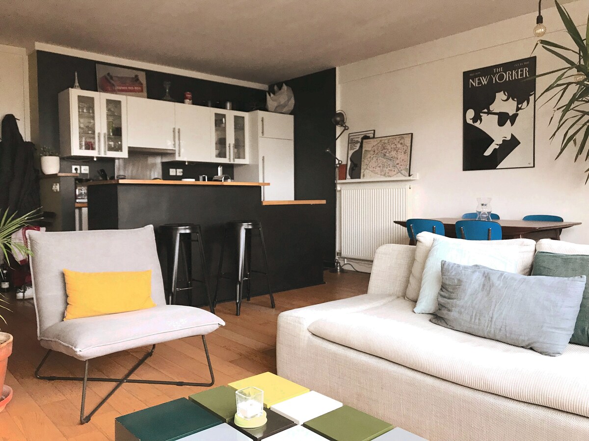 Kyrrlát, nútímaleg 45m2 2ja herbergja íbúð í vinsælasta hverfi Parísar, í 5 mínútna göngufjarlægð frá Jourdain-stöðinni og í 15 mínútna fjarlægð með neðanjarðarlest frá miðbænum (Notre Dame, Centre Pompidou, Grand Palais, Louvre-safninu o.s.frv.). Þú verður í 15 mínútna fjarlægð frá Parc des Buttes-Chaumont og líflega Belleville-hverfinu og umkringd/ur litlum tískuverslunum, börum og veitingastöðum.