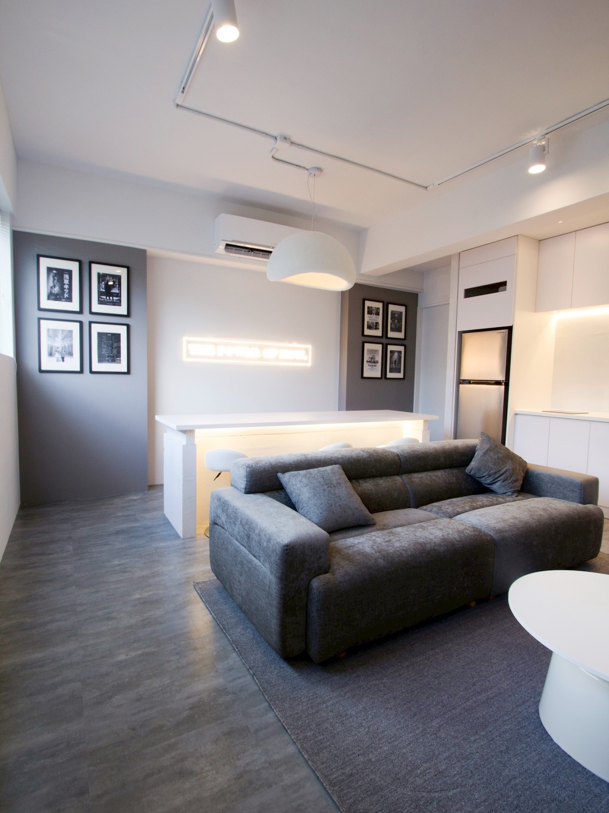 Íbúðin er í einum stíl: Gráir og svartir tónar í svipuðu litum, hreinar línur, minimalískur skrautmunir með áferðum, með örlítilli evrópskri listastíl og kvikmyndalegt yfirbragð.Þær eru tákn um rammann á veggnum og útsýnið yfir borgina og hver þeirra er sýn á lífið. Eitt herbergi: Hjónarúm (2 manns) Annað herbergi: mjög stórt einstaklingsherbergi (1 manneskja) Dýna fyrir fjórða einstakling á gólfi: Bókaðu aðeins ef þér er sama (1 einstaklingur) Sófi, bar, stólar Búnaður: 2 rakatæki, 2ja laga ísskápur, 3 loftræstingar, 1 vifta, síukaffivél, kaffiduft, síupappír, pottar og pönnur, súpuskeið, pottur, skófla, hnífur, gaffall, matarprjónar, eldhúshnífur, skurðarbretti, stór súpuskál, rúmábreiða, teppi, koddaver, aukateppi 200 * 230 stórt teppi Kóreskt sjampó, silkihárnæring, sturtusápa, sápa, förðunartakki, andlitsvatn, krem, andlitshreinsir, tannkrem, handklæði, baðhandklæði, þvottaefni Vinsamlegast komdu með: tannbursta (Boðið verður hvorki upp á tannbursta né rakvél)