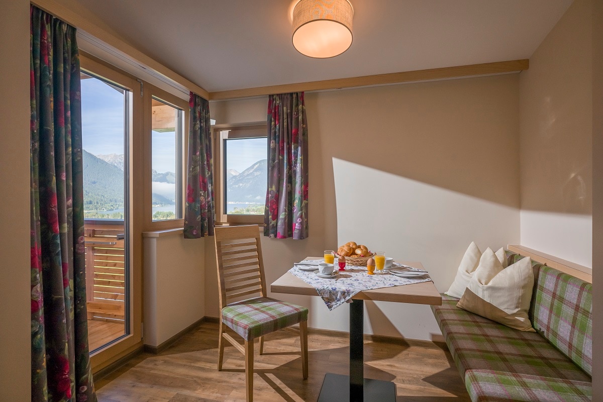 In der Kategorie Junior Suite mit Bergblick erwartet Sie ein über 30 m² großes Apartment für bis zu drei Personen mit Kingsize Doppelbett und einem qualitativ hochwertigem Einzelschlafsofa. Das Apartment verfügt über eine voll ausgestattete Küche mit gemütlicher Sitzecke, einem luxuriösen Badezimmer mit übergroßer Dusche und Waschtrockner sowie über eine 10 m² große Terrasse mit ausreichend Sitzgelegenheiten für ein herzhaftes Frühstück im Freien bei herrlichem Ausblick auf die Tiroler Bergwelt.