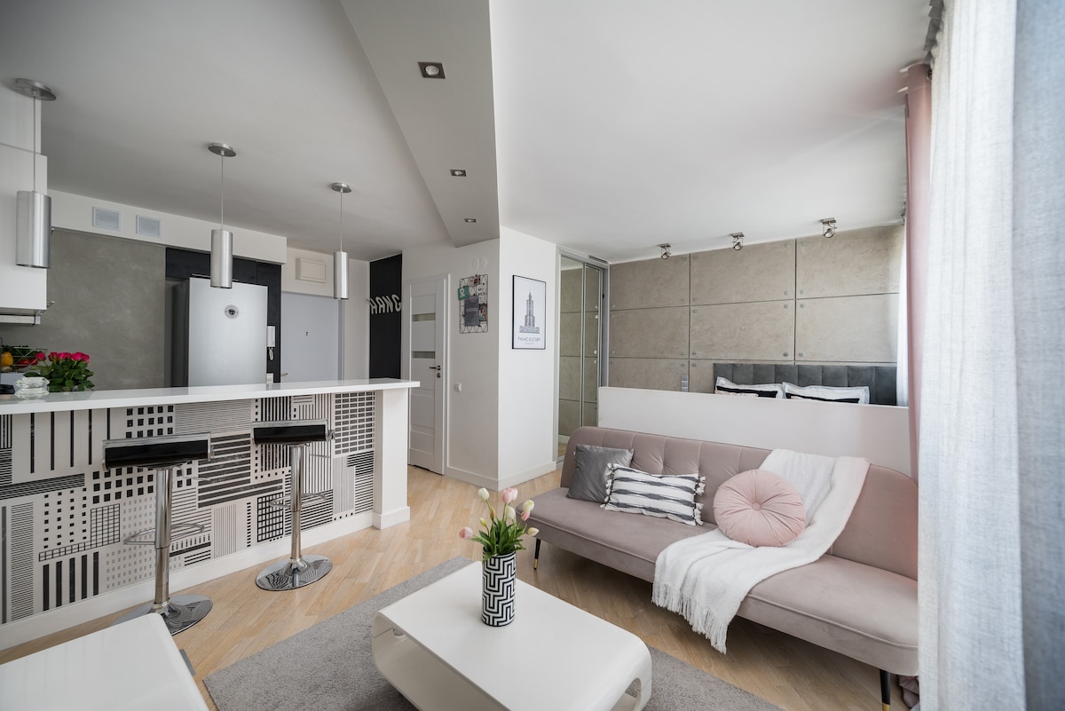 Rúmgóð, björt tveggja herbergja íbúð eftir endurbætur í hjarta borgarinnar. Íbúðin er á annarri hæð í fjölbýlishúsi með lyftu. Frá gluggunum er einstakt útsýni yfir menningar- og vísindahöllina. Byggingin er staðsett í 5 mínútna fjarlægð frá aðaljárnbrautarstöðinni. Nútímaleg innanhússhönnun með gömlum þáttum skapa einstakt andrúmsloft sem hentar vel fyrir frí eða viðskiptaferð.