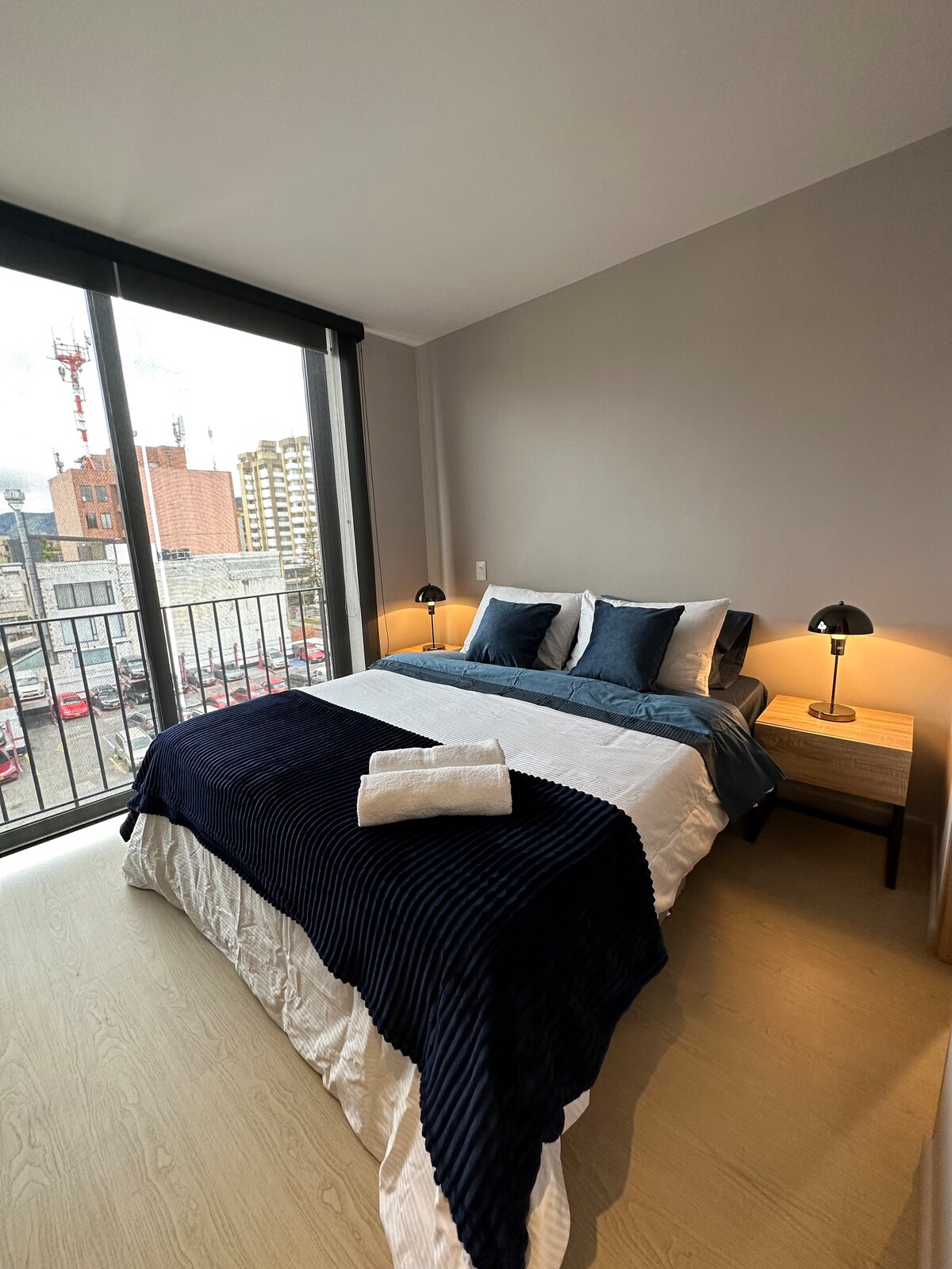 Þessi íbúð er fullkominn hópur eða flia Það er með 1 svefnherbergi, 1 sérbaðherbergi og svefnsófa. Það er með bestu gæðin í rúmfötum, hótellínudýnu, þægilega kodda og rafræna svarta staði. Nogal-hverfið er í innan við 5 mínútna göngufjarlægð frá vinsælustu verslunarmiðstöðvum Bogota, börum og veitingastöðum, apótekum og T-svæðinu. Svæðið einkennist af því að vera mjög öruggt, það erum við að vinna í aðeins nokkurra skrefa fjarlægð, almenningsgarðar og gönguleiðir eru nokkrir af mörgum áhugaverðum stöðum svæðisins.