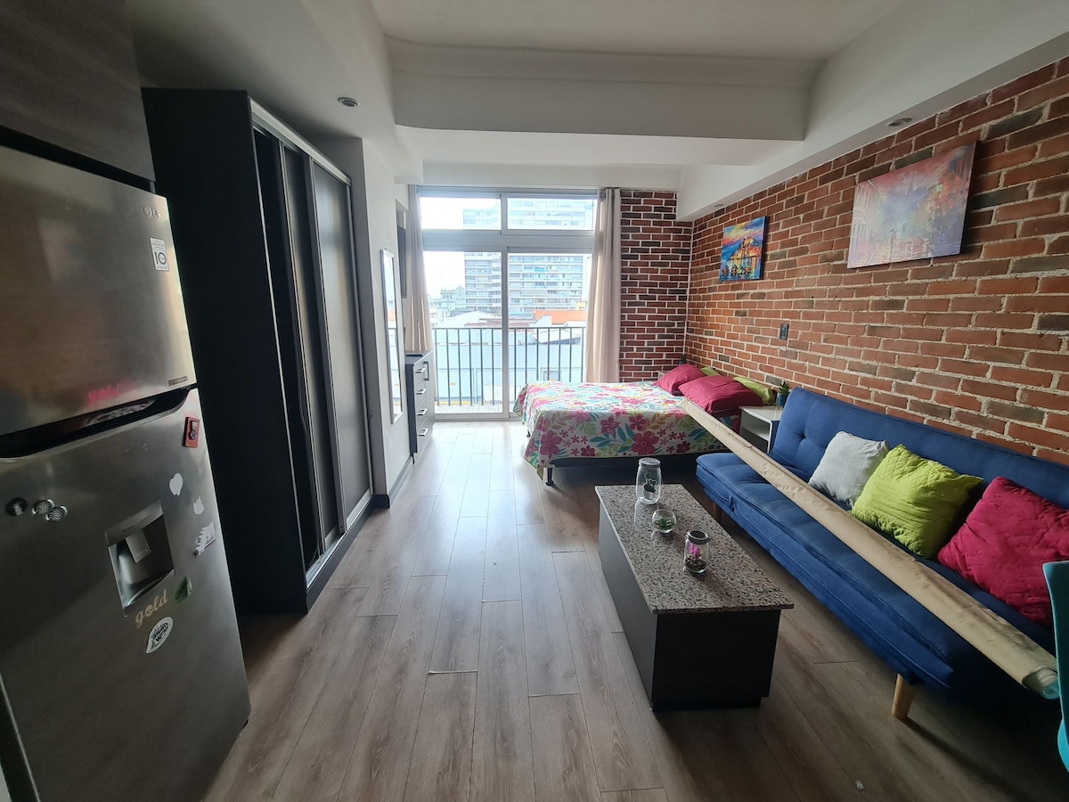 Þessi notalega loftíbúð gerir þér kleift að hafa tilvalin þægindi og staðsetningu fyrir dvöl þína. Þar er öll þjónusta og svalir með fallegu útsýni. Í nokkurra skrefa fjarlægð má finna fjölbreytta veitingastaði (jafnvel í byggingunni sjálfri!), kaffihús, byggingar og söguleg minnismerki, handverksmarkað. Góð staðsetningin gerir þér kleift að hafa greiðan aðgang að öllum hlutum borgarinnar og á 15 mínútum kemst þú þangað frá La Aurora-alþjóðaflugvellinum, með því að taka Uber eða leigubíl.