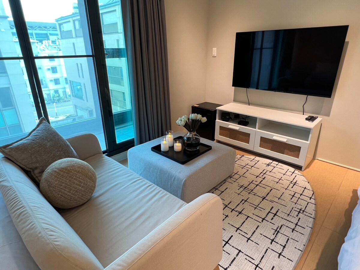 Þetta er björt, stílhrein, heillandi lúxusíbúð í miðbænum. Það er með þægilegan samgöngum, svo þú getur auðveldlega farið í MRT/High Speed Railway, staðbundna hefðbundna markaði, tjarnir osfrv. Íbúðin er með afslappandi Santorini samhengisþema og þægileg húsgögn. Þú getur eldað hollan mat í vel búnu eldhúsi og notið útsýnisins yfir tjörnina úr stofunni og hjónaherberginu.
